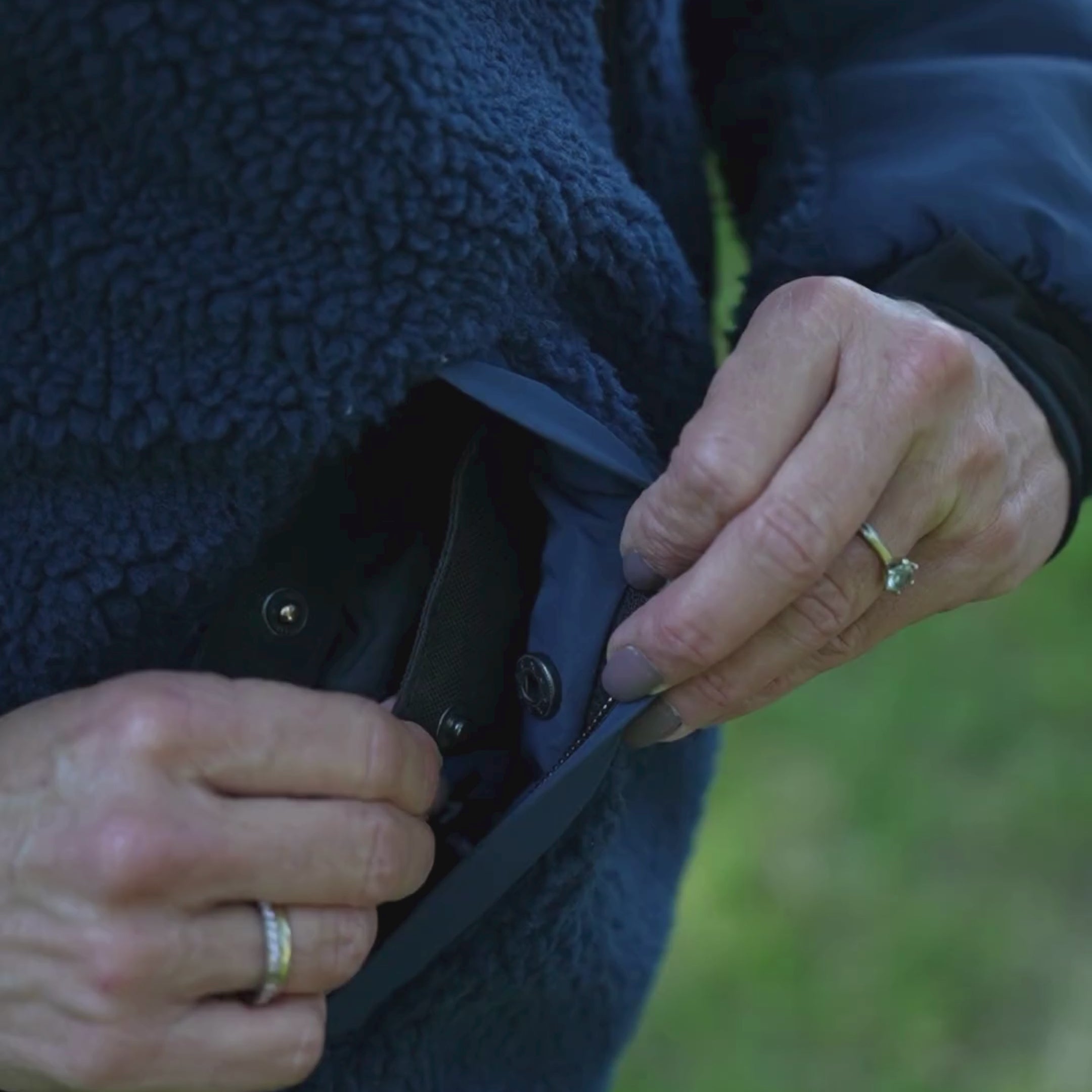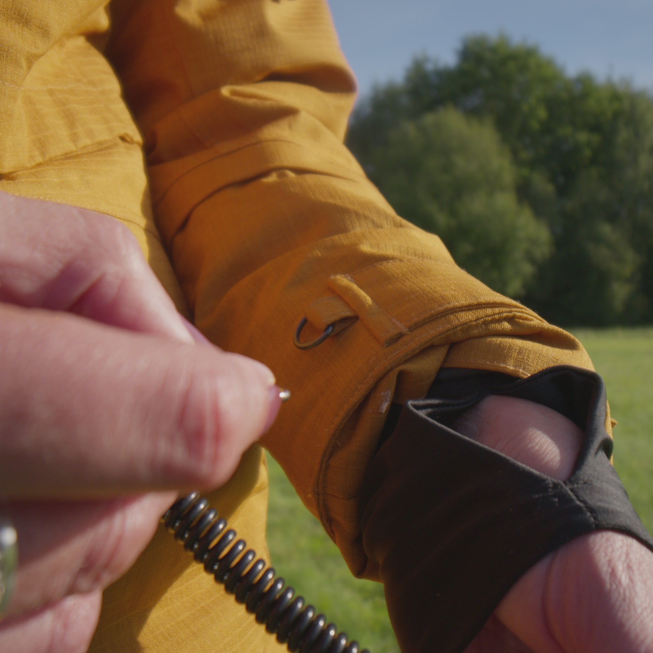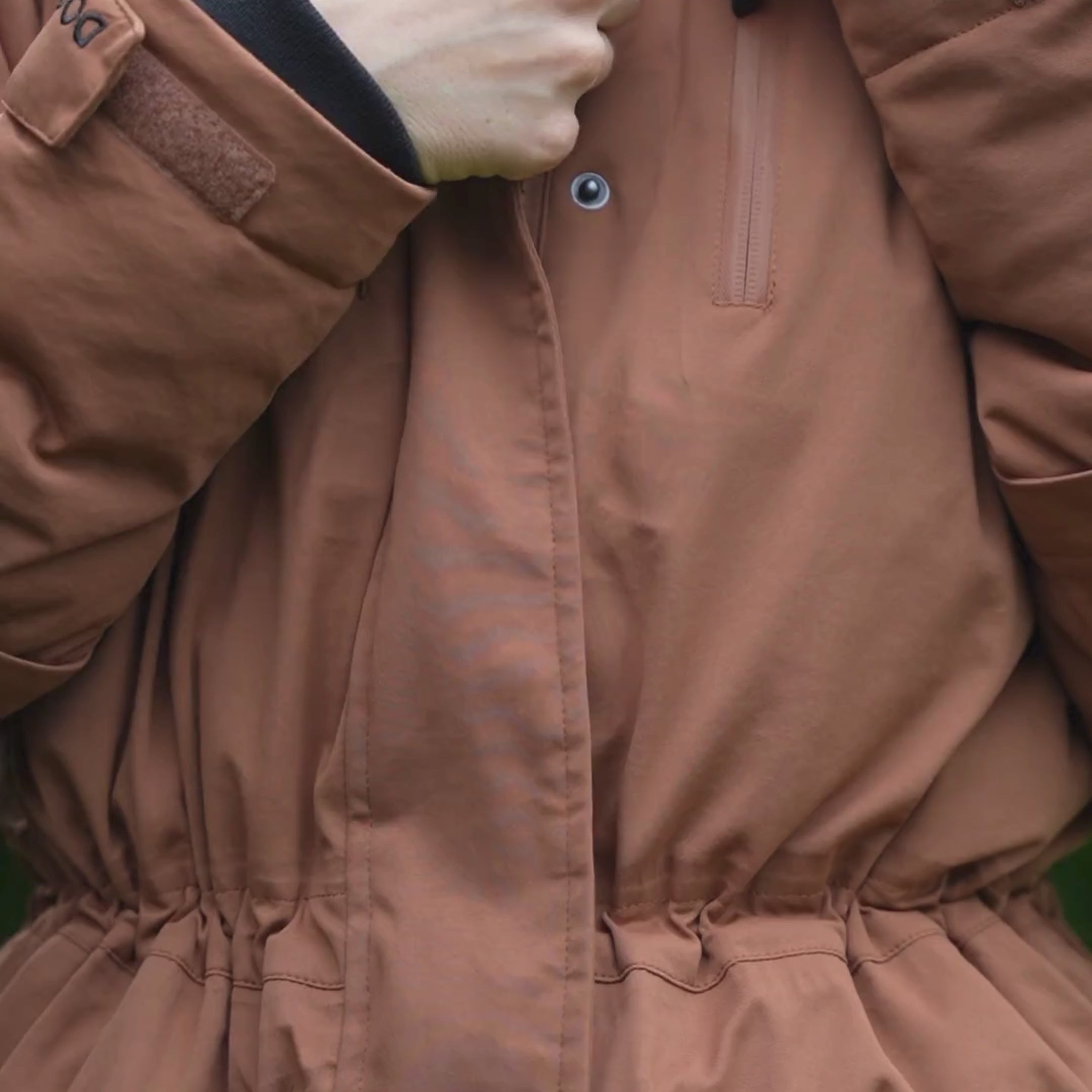 Indbyggede håndvarmere med tommelfingerhul og D-ringe ved håndled til klikker